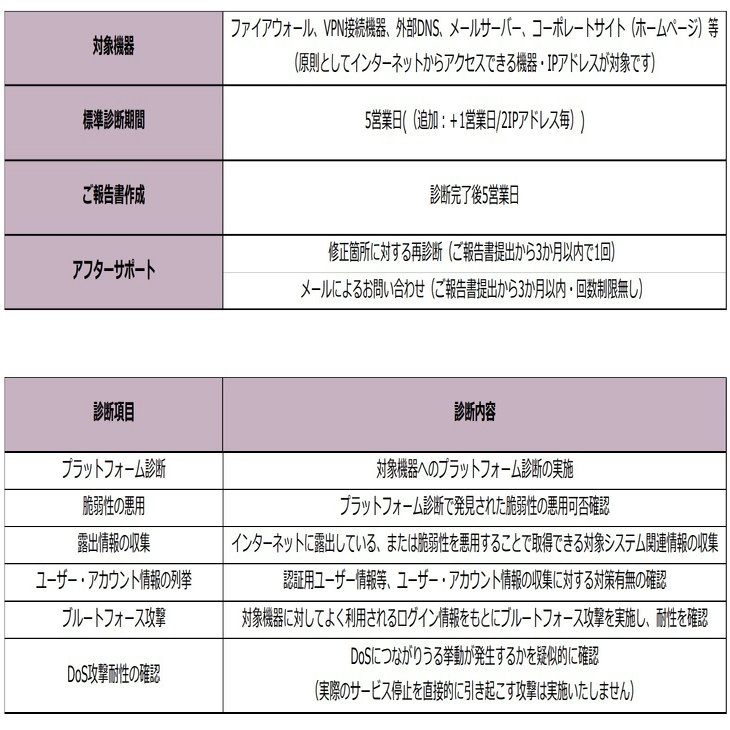 通常、プラットフォーム診断、ペネトレーションテスト、レッドチーム、TLPT と順に高度で難易度の高い試験になっ ていくが、本サービスは、プラットフォーム診断とペネトレーションテストの中間に位置するサービスで、インターネ ットに面したシステム(ファイヤーウォール、VPN 接続機器、外部DNS,メールサーバー、コーポレートサイ ト等)に対して、プラットフォーム診断に加えて、一般的によく見られる攻撃手法により簡易ペネトレーシ ョンテストを実施する基本的なパッケージサービスとなっており、これまでハードルの高かったペネトレー ションテストを実施してみたい企業様に待望のソリューションに仕上がっております。